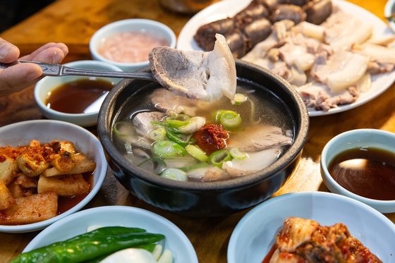 부산의 ‘소울푸드’는 누가 뭐래도 돼지국밥이다. 부산에만 돼지국밥 파는 식당이 600개가 넘는다(2019년 한국외식업중앙회). 수많은 돼지국밥집 중에서 미쉐린은 남구 용호동의 ‘합천국밥집⑫’과 남천동의 ‘안목’을 빕구르망으로 선정했다. 25년에 걸쳐 2대를 이어온 ‘합천국밥집’은 말갛게 끓이는 돼지국밥으로 정평이 났다. 천병철(65) 사장은 “육수는 오래 끓이는 것보다 어떤 부위를 쓰느냐가 더 중요하다”고 말했다. 합천국밥집은 잡뼈 없이 돼지 앞다리뼈로만 육수를 낸다. 국물만 보면 평양냉면에 가까울 만큼 빛깔이 맑다. 돼지고기 특유의 누린내를 꺼리는 사람도 부담 없이 즐길 만한 맛이다. 심심한 국물과 달리 멍게 넣은 무김치와 부추겉절이 등 밑반찬은 간간한 편이어서 궁합이 좋다. 수육에는 앞다릿살·삼겹살 외에 상대적으로 비싼 부위인 항정살도 올라왔다. 천 사장은 “식재료는 가장 좋은 국산만 고집한다”며 “돼지국밥은 정성과 재료를 아끼면 금방 표가 난다”고 말했다.