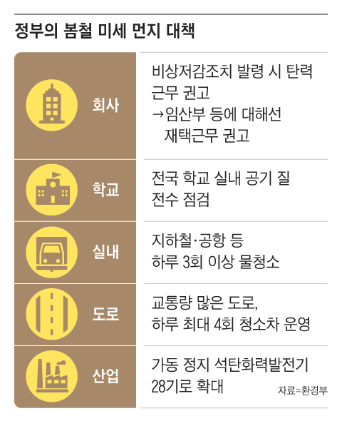 실내 공기 질 관리도 강화한다. 개학을 앞둔 전국 학교에선 이달 14일부터 실내 공기 질 전수 점검을 하고 있다. 29일까지 점검을 끝내고 문제가 있는 학교를 대상으로 공기 정화 설비 수리·교체 등 후속 조치를 하기로 했다. 지하철과 철도, 공항 등 미세 먼지가 많이 발생하는 공간에선 물청소를 하루 3회 이상 실시한다. 교통량이 많은 도로를 대상으로는 청소차 운행을 하루 최대 4회로 늘리기로 했다. 가동을 멈추는 석탄화력발전소 발전기도 기존 15기에서 28기로 확대한다.