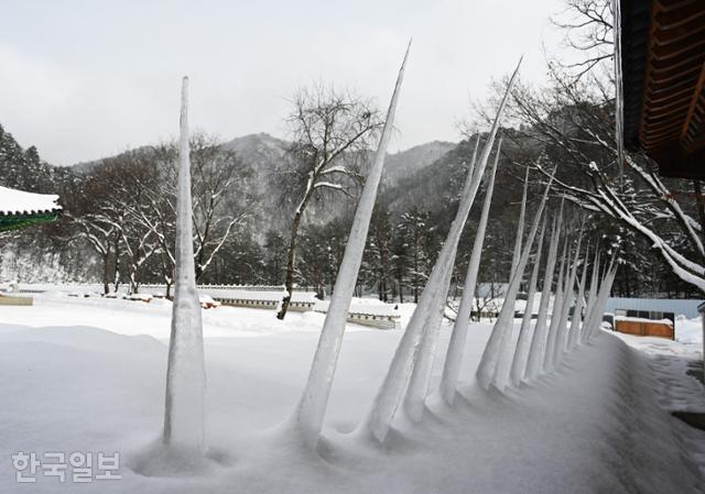 마을에서 다리를 건너면 바로 탐방로로 들어선다. 터널을 이룬 앙상한 나뭇가지마다 눈덩이가 소담스럽게 쌓였다. 계곡에는 맑은 물소리가 끊임없이 이어지고, 크고 작은 돌과 바위에도 하얀 눈이 소복하다. 세상의 온갖 잡음까지 눈 속에 묻혔으니 겨우내 시리고 모난 마음도 한결 둥글둥글해진다. 눈길 가는 곳마다 멋들어진 수묵화다. 먹을 잔뜩 머금은 붓놀림이 때로는 대범하게, 때로는 섬세하게 하얀 백지장을 스친 듯하다.