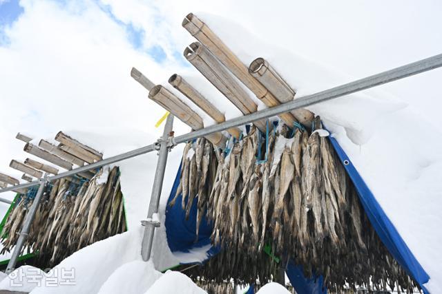 인제 용대리는 국내에서 으뜸가는 황태 산지다. 백담사 아래 백담마을의 식당도 대개 황태요리가 주메뉴다. 가게마다 차이는 있지만 산채비빔밥에도 황탯국이 딸려 나온다. 대부분 식당은 자체 황태덕장을 보유하고 있다. 겨우내 2, 3개월간 눈 속에서 얼고 녹기를 반복하며 말린다.