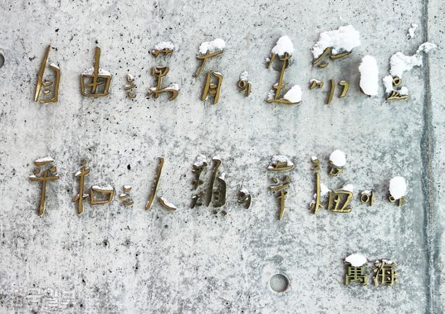 개울 건너 경내로 들어서면 금강문과 불이문이 나타나고 곧장 일직선 통로 끝에 본당인 극락보전이 나타난다. 마당에 작은 불탑 하나가 눈에 묻혀 있고, 전각은 사찰의 명성에 비하면 소박하다. 발길은 자연스럽게 오른쪽 만해기념관으로 향한다. 방문객이 거의 없는 탓에 문이 굳게 잠겼는데 마당에 만해 흉상과 시비가 세워져 있다. 모두가 아는 ‘님의 침묵’이 아니라 ‘나룻배 행인’으로, ‘나는 당신을 기다리면서 날마다 날마다 낡아 갑니다’로 마무리된다. 일제강점기 흙구덩이 속 망국의 절망에 내팽개쳐진 상황 속에서도 나라를 바로 세우고 주권이 회복되기를 바라는 백성의 마음을 담은 것으로 해석된다.