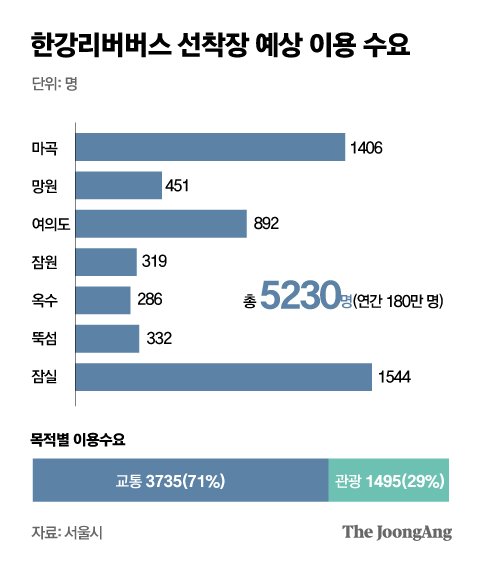 이예림 서울시 한강전략사업부장은 “현재도 한강을 찾는 시민이 많은 데다 리버버스가 활성화되면 더 많은 시민과 관광객이 찾아올 것”이라며 “이렇게 되면 선착장 내 편의시설을 이용하는 수요가 더 늘어나고, 기존의 주변 시설들도 함께 혜택을 볼 수 있을 거로 기대한다”고 말했다. 앞서 서울시는 지난해 리버버스 사업자인 이랜드그룹과 운영수익이 비용에 미달할 경우 차액을 보전해주는 내용의 협약도 맺었다.