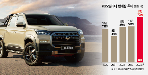 실제로 KG모빌리티는 공격적인 판매 목표량을 제시했다. 올해 연간 판매 목표량은 14만 7000대로 지난해 연간 판매량인 11만 6099대(반제품조립 180대 포함)보다 26.6% 높였다. 판매 성장으로 매출액 5조 5000억 원, 영업이익 1000억 원을 달성하겠다는 목표를 세웠다.