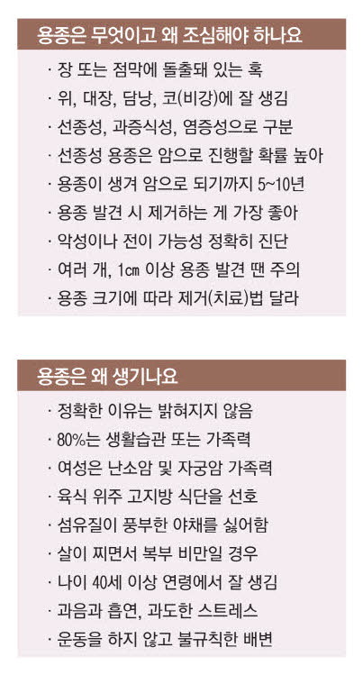 건강검진 때 대장내시경이나 위내시경을 받게 되면 간혹 용종(茸腫)이 있다는 얘기를 듣게 된다. 용종은 글자 그대로 점막이나 장막에 돌출되어 있다는 뜻이다. 영어로는 폴립(polyp)이라고 한다. 용종은 대장을 비롯해 다른 소화 장기 및 점막이 있는 모든 기관에서 생길 수 있다. 대표적인 용종은 대장 용종, 위 용종, 담낭 용종, 비(鼻) 용종 등이다. 주로 40세 이후에 발생하며 연령이 높아질수록 발생 빈도가 올라간다.