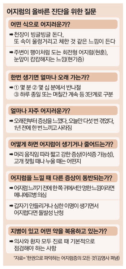 어지럼증은 크게 빙글빙글 눈이 돌아가는 '회전성(回轉性)', 둥실둥실 몸이 흔들리는 것처럼 느끼는 '부동성(浮動性)'으로 나뉜다. 부동성 현기증 환자가 회전성보다 약 2배 많다.
